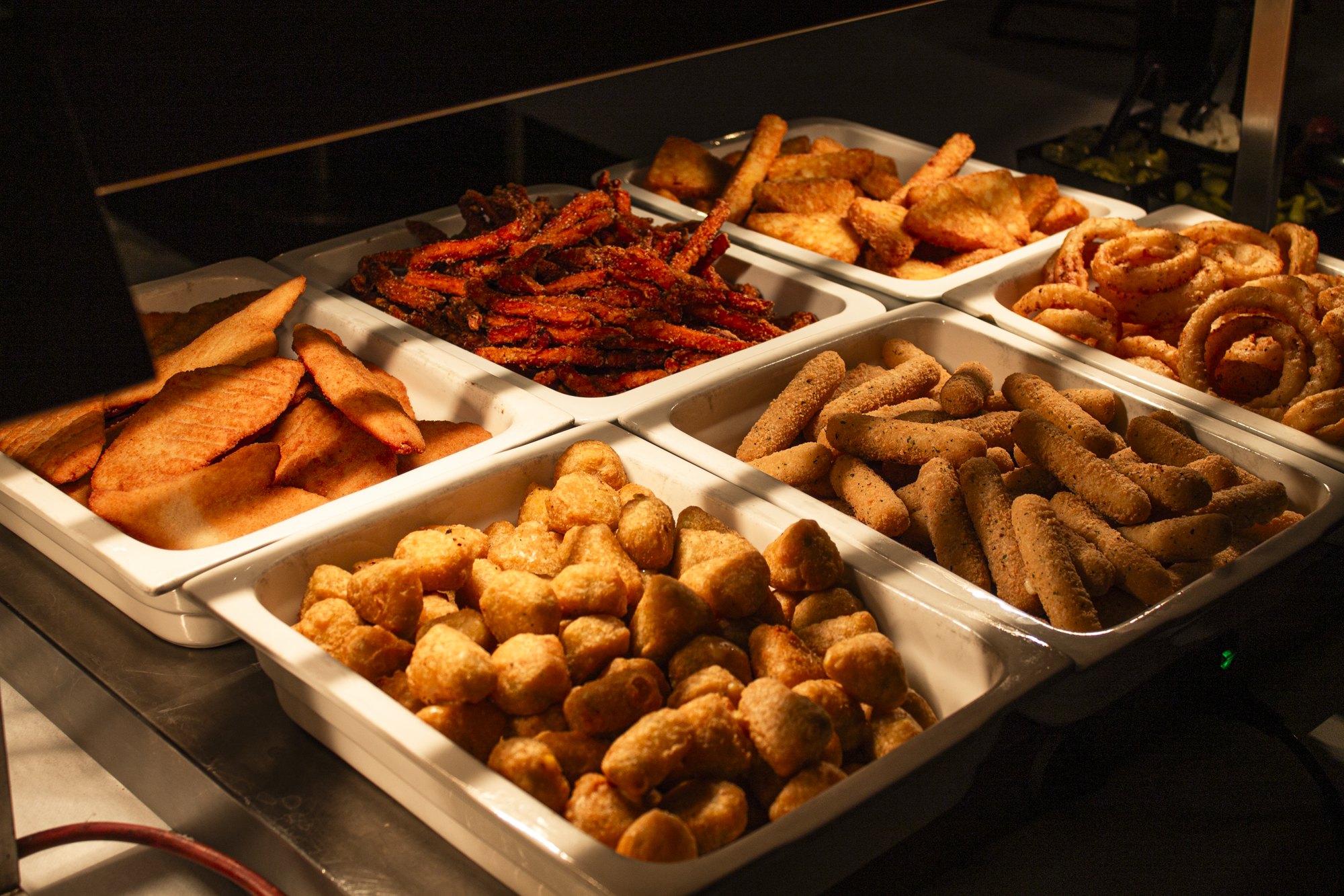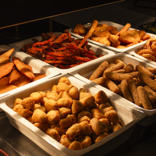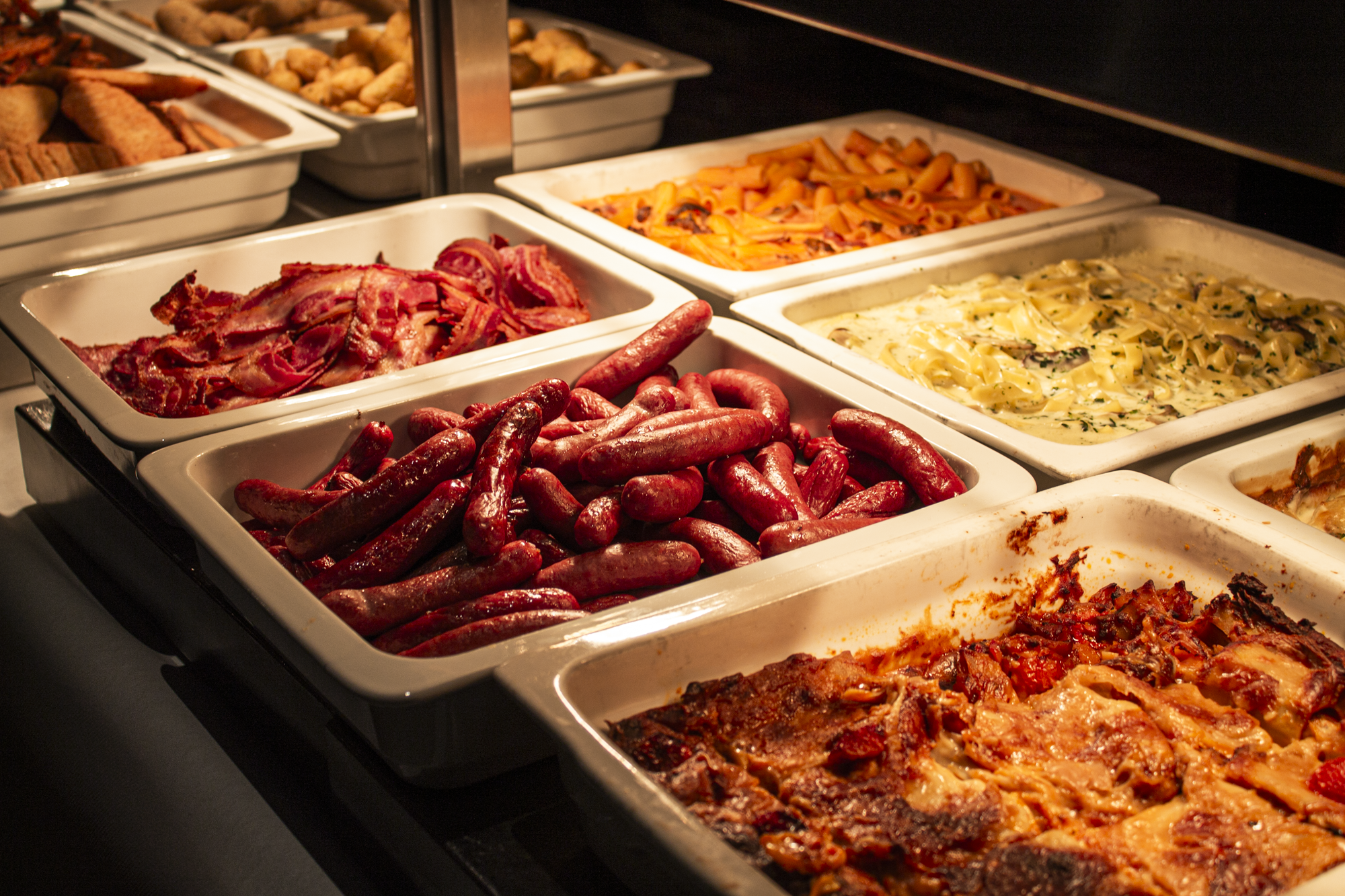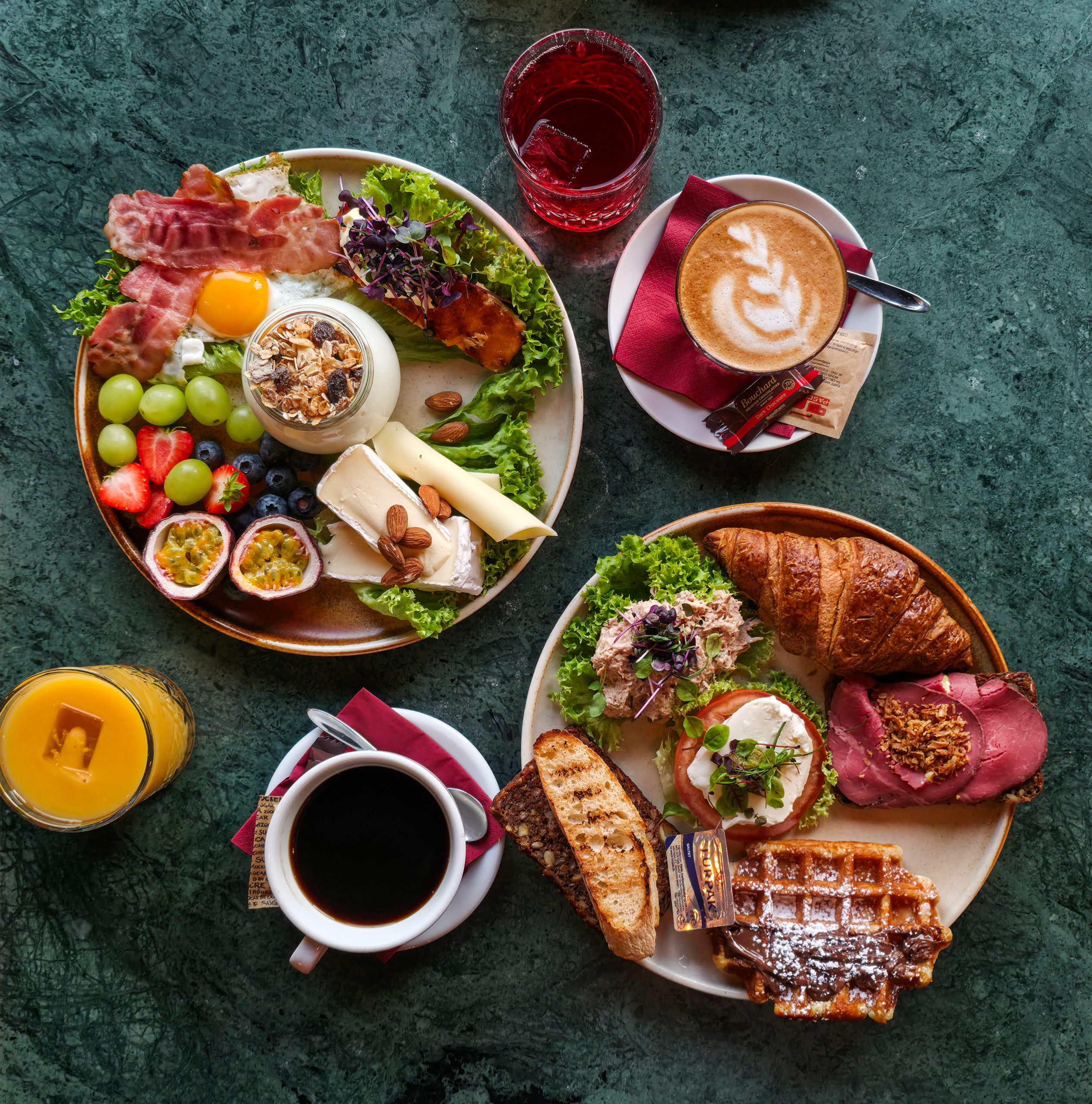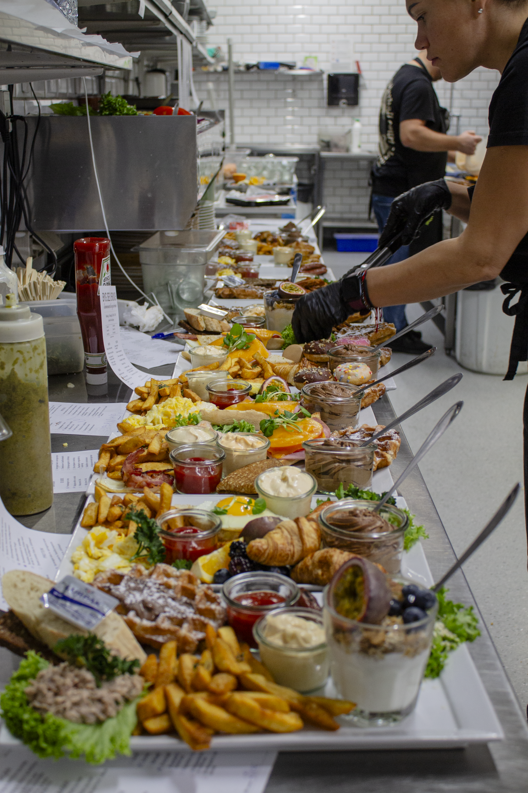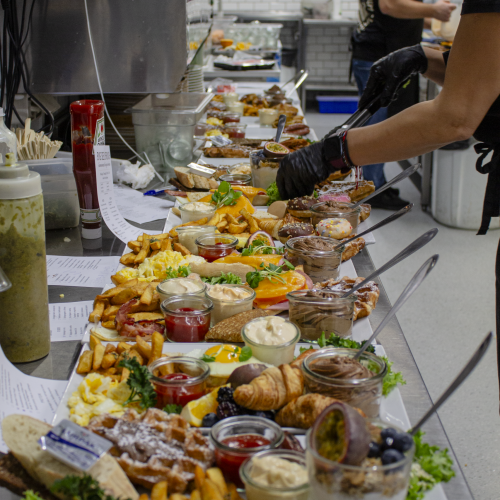 Spejlæg med stegt bacon, Roastbeef serveret på rugbrød med remoulade, og ristede løg, håndskårne pommes med chilimayo, varmrøget laks med estragoncreme, 1 stk. skiveost med marmelade, belgisk vaffel med nutella og en mini donut.